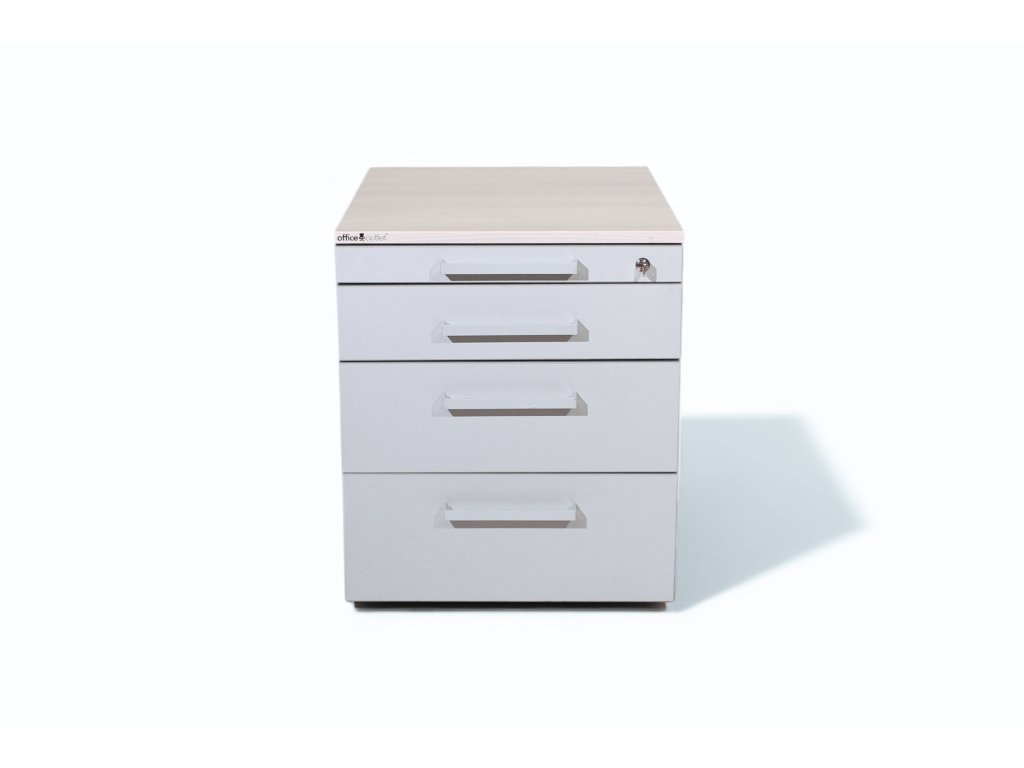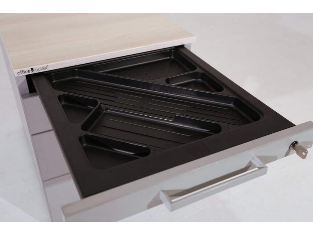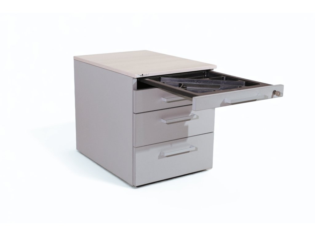 Zásuvkový kontejner Steelcase je na kolečkách, uzamykatelný a je složen z tužkovníku a třech šuplíků. Horní deska má dekor dřeva/ akácie. Korpus kontejneru je šedý.